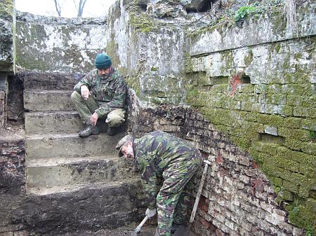 Zakończyliśmy już odkopywanie i usuwanie zalegającego gruzu i ziemi z wybieżni koszar, obu działobitni, budynku tradytora i budynkuobrony fosy. W trakcie tych prac wywiezionych zostało ponad 500 m3 ziemi - wyobrażacie sobie tą liczbę?! To 80 (słownie: osiemdziesiąt !!) wywrotek Kamaz !! Podczas odsłaniania działobitni zostały odkopane i wydobyte oryginalne granity spod kopuł pancernych wież artyleryjskich w ilości 9 sztuk. Pochodzą one z Alp i zostały tu przywiezione aby wzmocnić posady wież zgodnie ze sztuką architektury militarnej przełomu XIX i XX wieku. Granity te zostaną zamontowane w pierwotnym miejscu czyli na wieżach artyleryjskich.